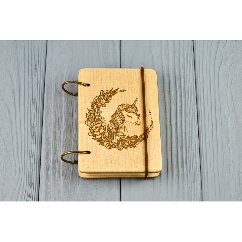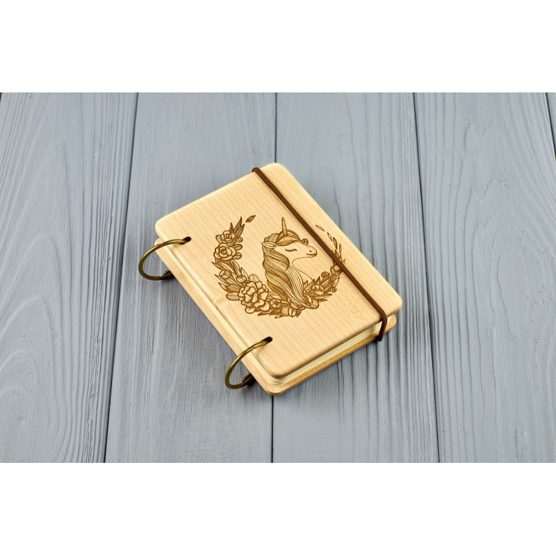 Кишеньковий блокнот з дерева формат А7 на кільцях "Єдиноріг"