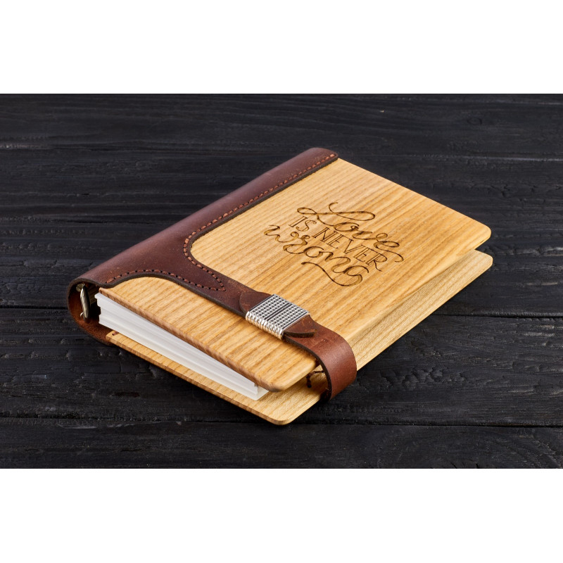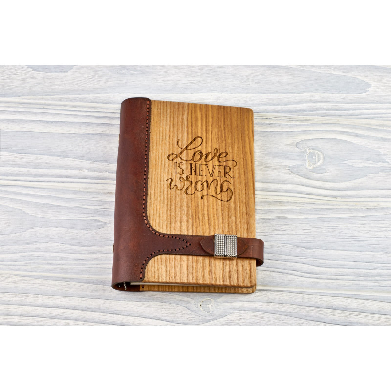 Блокнот з натурального дерева в поєднанні з шкірою "Love is never wrong" на магнітній застібці